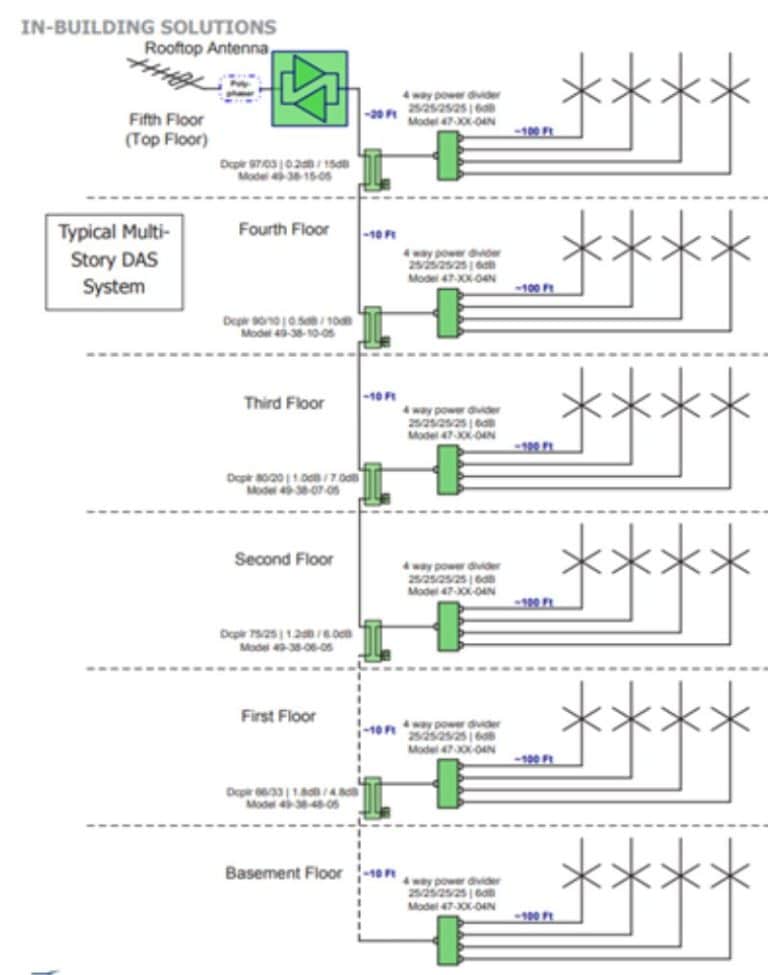 DAS is like the internal wiring of a building for wireless signals. It takes a strong signal from an outside source or from inside the building and distributes throughout the inside of the building. It does this using a coaxial, cat6 or fibre cable network along with strategically mounted small antennas. Think of it as an indoor antenna “net” that distributes the RF signal throughout the entire inside of the building.